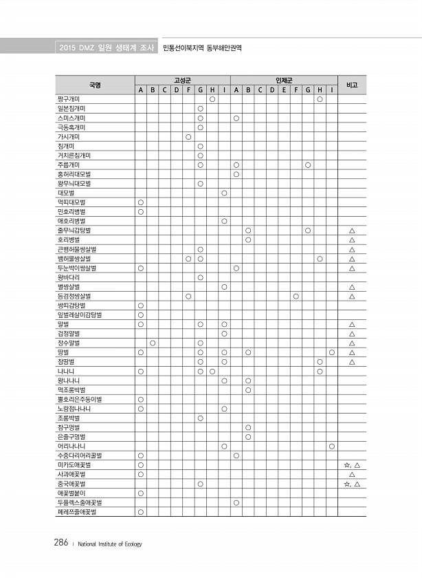 2015 DMZ 일원 생태계 조사 민통선이북지역 동부해안권역 286 ? National Institute of Ecology 국명 고성군 인제군 비고 A B C D F G H I A B C D E F G H I 짱구개미 ○ ○ 일본침개미 ○ 스미스개미 ○ ○ 극동혹개미 ○ 가시개미 ○ 침개미 ○ 거치른침개미 ○ 주름개미 ○ ○ ○ 홍허리대모벌 ○ 왕무늬대모벌 ○ 대모벌 ○ 먹띠대모벌 ○ 민호리병벌 ○ 애호리병벌 ○ 줄무늬감탕벌 ○ ○ △ 호리병벌 ○ △ 큰뱀허물쌍살벌 ○ △ 뱀허물쌍살벌 ○ ○ ○ △ 두눈박이쌍살벌 ○ ○ △ 왕바다리 ○ 별쌍살벌 ○ △ 등검정쌍살벌 ○ ○ △ 쌍띠감탕벌 ○ 잎벌레살이감탕벌 ○ 말벌 ○ ○ ○ △ 검정말벌 ○ △ 장수말벌 ○ ○ △ 땅벌 ○ ○ ○ ○ ○ △ 참땅벌 ○ ○ ○...