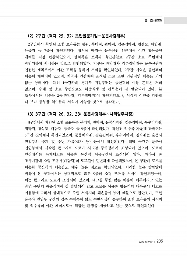 Ⅱ. 조사결과 www.nie.re.kr ? 285 2 2구간 격자 25, 32못안골분기점∼운문사경계부 2구간에서 확인된 소형 포유류는 땃쥐, 두더지, 관박쥐, 검은집박쥐, 청설모, 다람쥐, 등줄쥐 등 7종이 확인되었다. 첨서목 땃쥐는 문수선원 인근에서 야간 활동중인 개체를 직접 관찰하였으며, 설치목은 포획과 육안관찰로 2구간 소로 주변에서 광범위하게 서식하는 것으로 확인되었다. 익수목 관박쥐와 검은집박쥐는 문수선원과 인접한 계곡부에서 야간 포획을 통하여 서식을 확인하였다. 2구간 지역은 등산객의 이용이 제한되어 있으며, 계곡과 인접하여 조성된 소로 또한 인위적인 훼손은 거의 없는 상태이다. 특히 1구간과의 경계부 지점부터는 등산객의 이용 흔적은 거의 없으며, 수계 및 소로 주변으로도 하층식생 및 관목층이 잘...