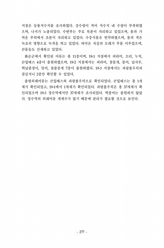 277 지점은 등룡저수지를 조사하였다. 강수량이 적어 저수지 내 수량이 부족하였 으며, 나지가 노출되었다. 수변부는 주로 목본이 자리하고 있었으며, 물과 가 까운 부위에서 초본이 자리하고 있었다. 수중식물은 빈약하였으며, 물의 색은 녹조의 영향으로 녹색을 띄고 있었다. 바닥은 자갈과 모래가 주를 이루었으며, 큰돌들도 산재하고 있었다. 화순군에서 확인된 어류는 총 11종이며, 19-1 지점에서 피라미, 끄리, 누치, 큰입배스 4종이 출현하였으며, 19-2 지점에서는 피라미, 참몰개, 붕어, 납자루, 떡납줄갱이, 밀어, 점줄종개 7종이 출현하였다. 19-3 지점에서는 파랑볼우럭과 참갈겨니 2종만 확인할 수 있었다. 출현외래어류는 큰입배스와 파랑볼우럭으로 확인되었다. 큰입배스는 총 1개 체가 확인되었고, 19-1...