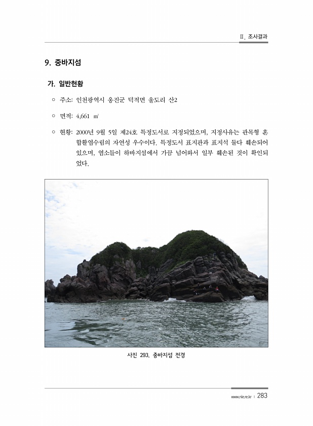 Ⅱ. 조사결과 www.nie.re.kr ? 283 9. 중바지섬 가. 일반현황 ? 주소인천광역시 옹진군 덕적면 울도리 산2 ? 면적4,661 ㎡ ? 현황2000년 9월 5일 제24호 특정도서로 지정되었으며, 지정사유는 관목형 혼 합활엽수림의 자연성 우수이다. 특정도서 표지판과 표지석 둘다 훼손되어 있으며, 염소들이 하바지섬에서 가끔 넘어와서 일부 훼손된 것이 확인되 었다. 사진 293. 중바지섬전경