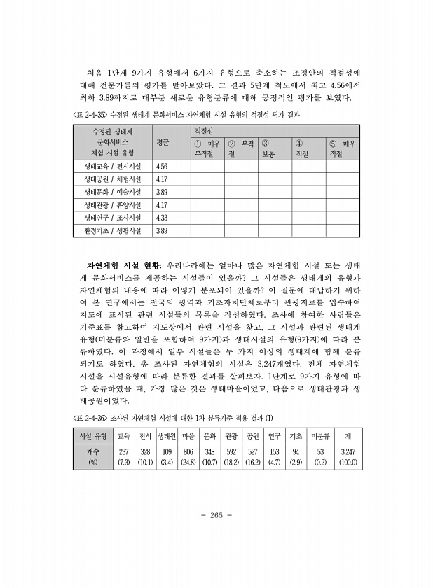265 처음 1단계 9가지 유형에서 6가지 유형으로 축소하는 조정안의 적절성에 대해 전문가들의 평가를 받아보았다. 그 결과 5단계 척도에서 최고 4.56에서 최하 3.89까지로 대부분 새로운 유형분류에 대해 긍정적인 평가를 보였다. 수정된 생태계 문화서비스 체험 시설 유형 평균 적절성 ① 매우 부적절 ② 부적 절 ③ 보통 ④ 적절 ⑤ 매우 적절 생태교육 전시시설 4.56 생태공원 체험시설 4.17 생태문화 예술시설 3.89 생태관광 휴양시설 4.17 생태연구 조사시설 4.33 환경기초 생활시설 3.89 표 2-4-35 수정된 생태계 문화서비스 자연체험 시설 유형의 적절성 평가 결과 자연체험 시설 현황우리나라에는 얼마나 많은 자연체험 시설 또는 생태 계 문화서비스를 제공하는 시설들이 있을까? 그 시설들은 생태...