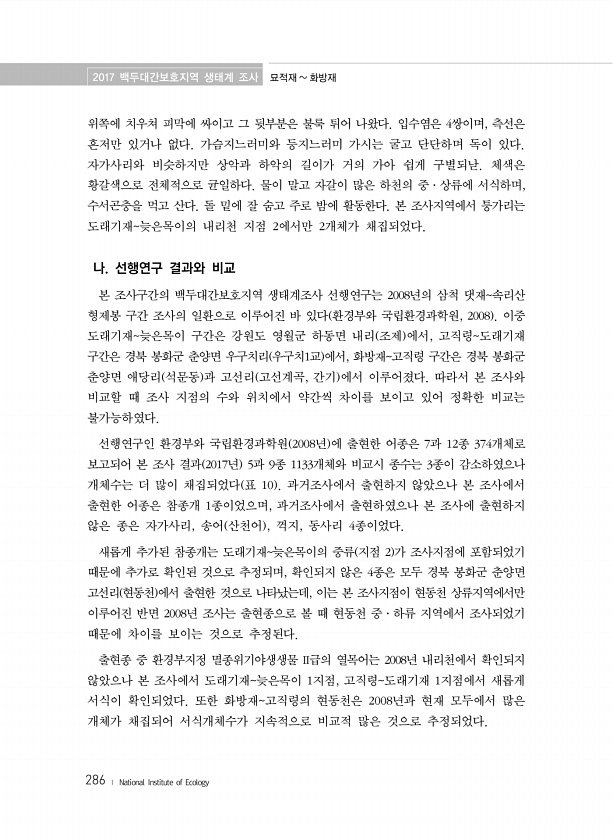 2017 백두대간보호지역 생태계 조사 묘적재 화방재 286 ? National Institute of Ecology 위쪽에 치우쳐 피막에 싸이고 그 뒷부분은 불룩 튀어 나왔다. 입수염은 4쌍이며, 측선은 흔저만 있거나 없다. 가슴지느러미와 등지느러미 가시는 굴고 단단하며 독이 있다. 자가사리와 비슷하지만 상악과 하악의 길이가 거의 가아 쉽게 구별되낟. 체색은 황갈색으로 전체적으로 균일하다. 물이 말고 자갈이 많은 하천의 중·상류에 서식하며, 수서곤충을 먹고 산다. 돌 밑에 잘 숨고 주로 밤에 활동한다. 본 조사지역에서 퉁가리는 도래기재늦은목이의 내리천 지점 2에서만 2개체가 채집되었다. 나. 선행연구 결과와 비교 본 조사구간의 백두대간보호지역 생태계조사 선행연구는 2008년의 삼척 댓재속리산 형제봉 구간 조...
