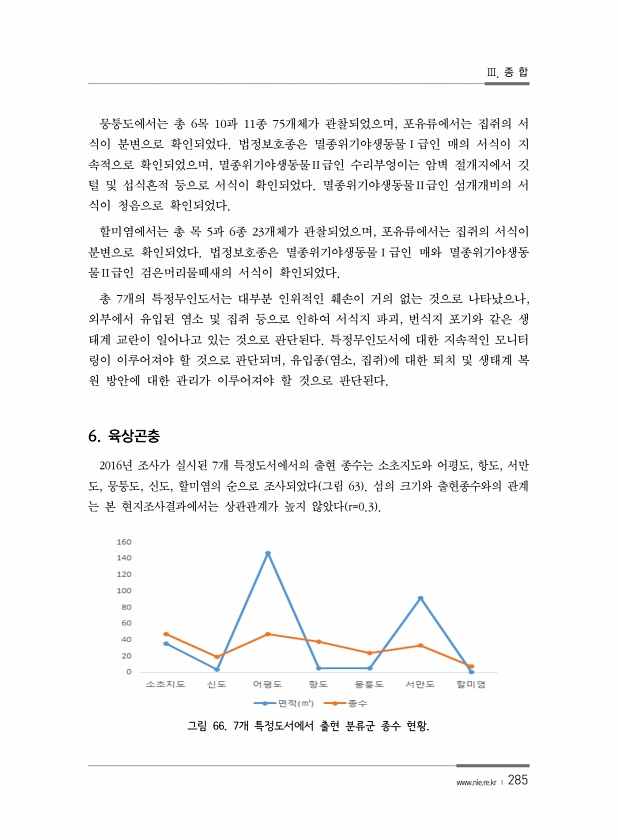 Ⅲ. 종 합 www.nie.re.kr ? 285 뭉퉁도에서는 총 6목 10과 11종 75개체가 관찰되었으며, 포유류에서는 집쥐의 서 식이 분변으로 확인되었다. 법정보호종은 멸종위기야생동물Ⅰ급인 매의 서식이 지 속적으로 확인되었으며, 멸종위기야생동물Ⅱ급인 수리부엉이는 암벽 절개지에서 깃 털 및 섭식흔적 등으로 서식이 확인되었다. 멸종위기야생동물Ⅱ급인 섬개개비의 서 식이 청음으로 확인되었다. 할미염에서는 총 목 5과 6종 23개체가 관찰되었으며, 포유류에서는 집쥐의 서식이 분변으로 확인되었다. 법정보호종은 멸종위기야생동물Ⅰ급인 매와 멸종위기야생동 물Ⅱ급인 검은머리물떼새의 서식이 확인되었다. 총 7개의 특정무인도서는 대부분 인위적인 훼손이 거의 없는 것으로 나타났으나, 외부에서 유입된 염소 및 집쥐 등으로 인하여...