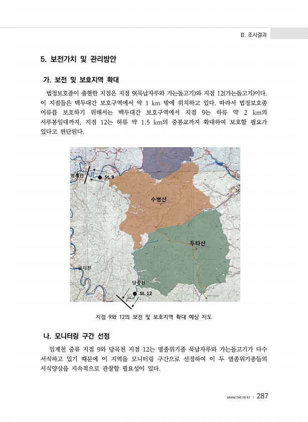 Ⅱ. 조사결과 www.nie.re.kr ? 287 5. 보전가치 및 관리방안 가. 보전 및 보호지역 확대 법정보호종이 출현한 지점은 지점 9 묵납자루와 가는돌고기 와 지점 12 가는돌고기 이다. 이 지점들은 백두대간 보호구역에서 약 1 km 밖에 위치하고 있다. 따라서 법정보호종 어류를 보호하기 위해서는 백두대간 보호구역에서 지점 9는 하류 약 2 km의 시루봉일대까지, 지점 12는 하류 약 1.5 km의 중봉교까지 확대하여 보호할 필요가 있다고 판단된다. 지점 9와 12의 보전 및 보호지역 확대 예상 지도 나. 모니터링 구간 선정 임계천 중류 지점 9와 당곡천 지점 12는 멸종위기종 묵납자루와 가는돌고기가 다수 서식하고 있기 때문에 이 지역을 모니터링 구간으로 선정하여 이 두 멸종위기종들의 서식양상을 지속...