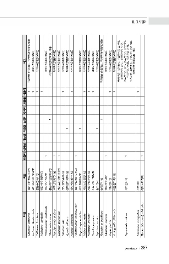 www ·nie·re·kr ? 287 학명 국명 도창리 성재산 대성산 적근산 산양리 주파리 고둔골 비운이 비고 Catocala eminens 북방노랑뒷날개나방 1 국외반출 승인대상, 적색목록 미평가 NE Trebania flavifrontalis 붉은머리비단명나방 1 적색목록 미평가 NE Calliteara lunulata 붉은수염독나방 1 적색목록 미평가 NE Maladera verticalis 빨간색우단풍뎅이 1 Phthonandria atrilineata 뽕나무가지나방 1 적색목록 미평가 NE Olethreutes mori 뽕큰애기잎말이나방 1 적색목록 미평가 NE , 해충 Neodrymonia deliana 뾰족날개재주나방 1 적색목록 미평가 NE Catocala proxeneta 사슴노랑뒷날개나방 ...