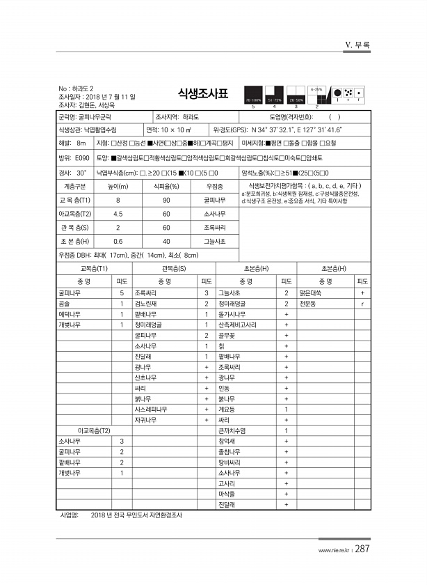 V. 부 록 www.nie.re.kr ?287 No 하과도 2 조사일자 2018 년 7 월 11 일 조사자김현돈, 서상욱 식생조사표 군락명굴피나무군락 조사지역하과도 도엽명 격자번호 식생상관낙엽활엽수림 면적10 × 10 ㎡ 위?경도 GPS N 34° 3732.1, E 127° 3141.6해발8m 지형□산정 □능선 ■사면 □상□중■하 □계곡□평지 미세지형■평면 □돌출 □함몰 □요철 방위E090 토양■갈색삼림토□적황색삼림토□암적색삼림토□회갈색삼림토□침식토□미숙토□암쇄토 경사30° 낙엽부식층 cm □.≥20 □ 15 ■ 10 □ 5 □0 암석노출 % □≥51■ 25□ 5□0 계층구분 높이 m 식피율 % 우점종 식생보전가치평가항목 a, b, c, d, e, 기타 a분포희귀성, b식생복원 잠재성, c구성식물종온전성, ...