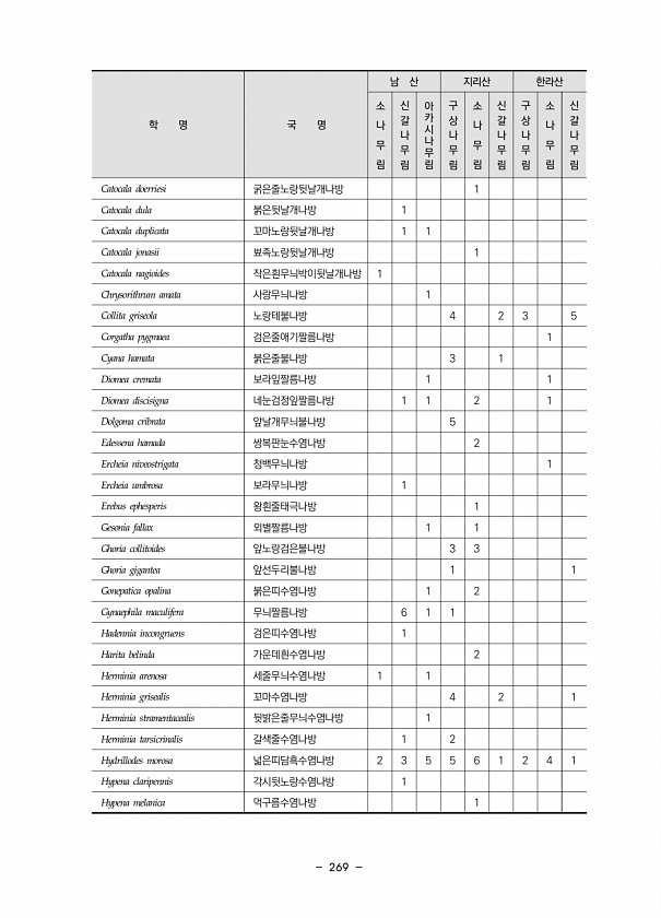 269 학 명 국 명 남 산 지리산 한라산 소 나 무 림 신 갈 나 무 림 아카시나무림 구 상 나 무 림 소 나 무 림 신 갈 나 무 림 구 상 나 무 림 소 나 무 림 신 갈 나 무 림 Catocala doerriesi 굵은줄노랑뒷날개나방 1 Catocala dula 붉은뒷날개나방 1 Catocala duplicata 꼬마노랑뒷날개나방 1 1 Catocala jonasii 뾰족노랑뒷날개나방 1 Catocala nagioides 작은흰무늬박이뒷날개나방 1 Chrysorithrum amata 사랑무늬나방 1 Collita griseola 노랑테불나방 4 2 3 5 Corgatha pygmaea 검은줄애기짤름나방 1 Cyana hamata 붉은줄불나방 3 1 Diomea cremata 보라잎짤름나방 1 1 Di...