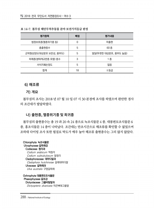2018 전국 무인도서 자연환경조사 여수 3 288 ? National Institute of Ecology 평가항목 배점 평가내용 법정보호종 멸종위기종 등 0 미출현 총출현종수 5 60 종 군락형성정도 대상분포 보존성, 풍부도 5 발달 뚜렷한 대상분포, 풍부도 높음 외래종 생태계교란종 포함 종수 3 1 종 서식지훼손정도 5 없음 합계 18 Ⅱ등급 표 14-7. 볼무섬 해안무척추동물 분야 보전가치등급 판정 6 볼무섬의 조사는 2018 년 07 월 10 일 07 시 30 분경에 조사를 하였으며 완만한 경사 의 조간대가 발달하였다. , 볼무섬의 출현종수는 총 19 과 20 속 24 종으로 녹조식물문 4 종, 대롱편모조식물문 6 종, 홍조식물문 14 종이 나타났다. 조간대는 만조시간으로 해조류를 확인할 수 없었으...