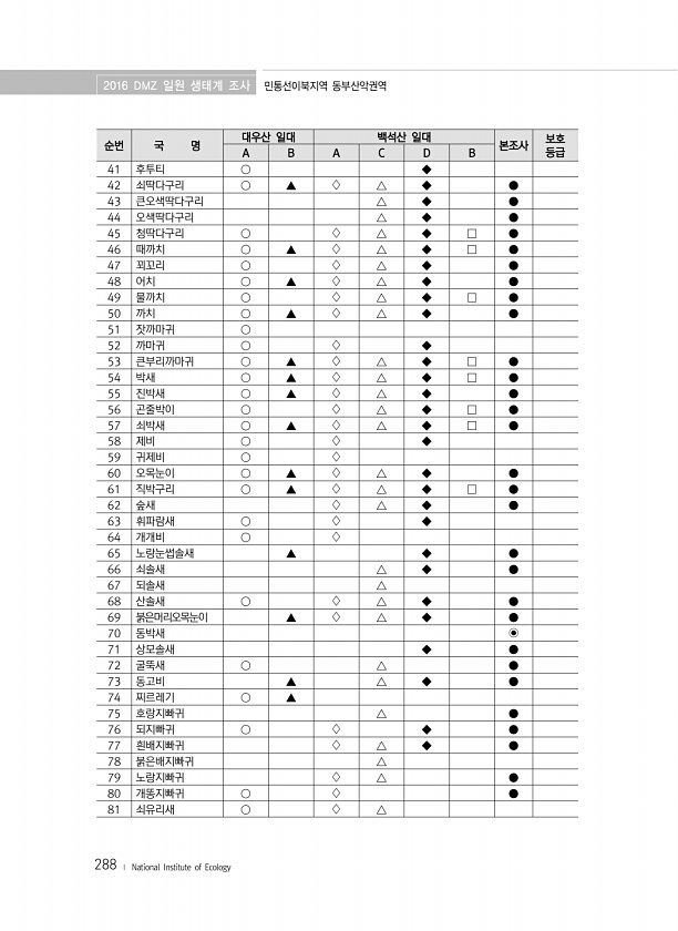 2016 DMZ 일원 생태계 조사 민통선이북지역 동부산악권역 288 ? National Institute of Ecology 순번 국 명 대우산 일대 백석산 일대 본조사 보호 A B A C D B 등급 41 후투티 ○ ◆ 42 쇠딱다구리 ○ ▲ ? △ ◆ ● 43 큰오색딱다구리 △ ◆ ● 44 오색딱다구리 △ ◆ ● 45 청딱다구리 ○ ? △ ◆ □ ● 46 때까치 ○ ▲ ? △ ◆ □ ● 47 꾀꼬리 ○ ? △ ◆ ● 48 어치 ○ ▲ ? △ ◆ ● 49 물까치 ○ ? △ ◆ □ ● 50 까치 ○ ▲ ? △ ◆ ● 51 잣까마귀 ○ 52 까마귀 ○ ? ◆ 53 큰부리까마귀 ○ ▲ ? △ ◆ □ ● 54 박새 ○ ▲ ? △ ◆ □ ● 55 진박새 ○ ▲ ? △ ◆ ● 56 곤줄박이 ○ ? △ ◆ □ ● 57...