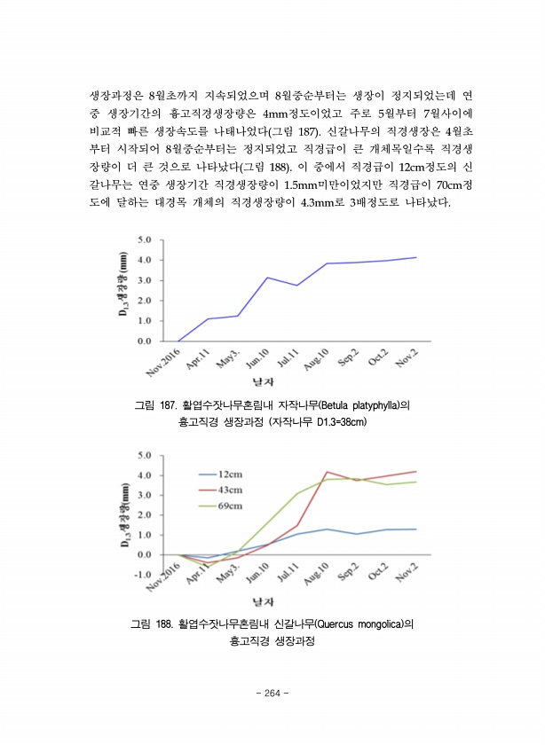 생장과정은 8월초까지 지속되었으며 8월중순부터는 생장이 정지되었는데 연 중 생장기간의 흉고직경생장량은 4mm정도이었고 주로 5월부터 7월사이에 비교적 빠른 생장속도를 나태나었다 그림 187 신갈나무의 직경생장은 4월초 부터 시작되어 8월중순부터는 정지되었고 직경급이 큰 개체목일수록 직경생 장량이 더 큰 것으로 나타났다 그림 188 이 중에서 직경급이 12cm정도의 신 갈나무는 연중 생장기간 직경생장량이 1.5mm미만이었지만 직경급이 70cm정 도에 달하는 대경목 개체의 직경생장량이 4.3mm로 3배정도로 나타났다. 그림 187. 활엽수잣나무혼림내 자작나무 Betula platyphylla 의 흉고직경 생장과정 자작나무 D1.3=38cm 그림 188. 활엽수잣나무혼림내 신갈나무 Quercus mongolica...