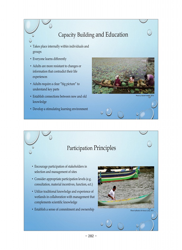 Participation Principles ? Encourage participation of stakeholders in selection and management of sites ? Consider appropriate participation levels e.g. consultation, material incentives, function, ect. ? Utilize traditional knowledge and experience of wetlands in collaboration with management that complements scientific knowledge ? Establish a sense of commitment and ownership Photo byBeatriz De ...