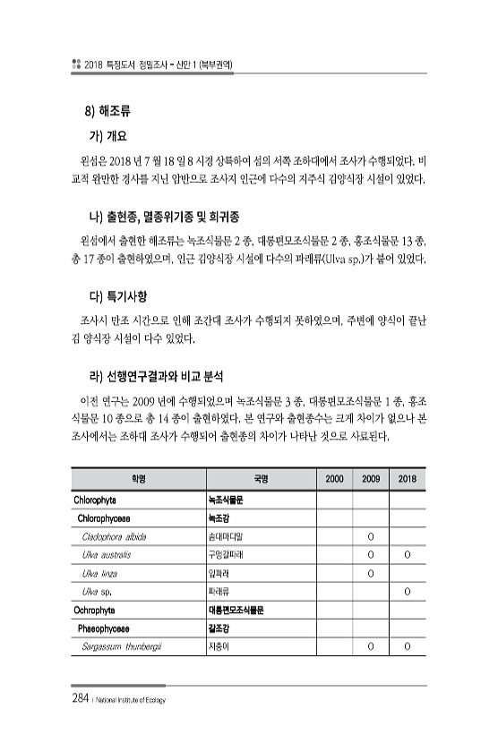 2018 특정도서 정밀조사 신안 1 북부권역 284 ? National Institute of Ecology 8 왼섬은 2018 년 7 월 18 일 8 시경 상륙하여 섬의 서쪽 조하대에서 조사가 수행되었다. 비 교적 완만한 경사를 지닌 암반으로 조사지 인근에 다수의 지주식 김양식장 시설이 있었다. , 왼섬에서 출현한 해조류는 녹조식물문 2 종, 대롱편모조식물문 2 종, 홍조식물문 13 종, 총 17 종이 출현하였으며, 인근 김양식장 시설에 다수의 파래류 Ulva sp. 가 붙어 있었다. 조사시 만조 시간으로 인해 조간대 조사가 수행되지 못하였으며, 주변에 양식이 끝난 김 양식장 시설이 다수 있었다. 이전 연구는 2009 년에 수행되었으며 녹조식물문 3 종, 대롱편모조식물문 1 종, 홍조 식물문 10 종으로 ...
