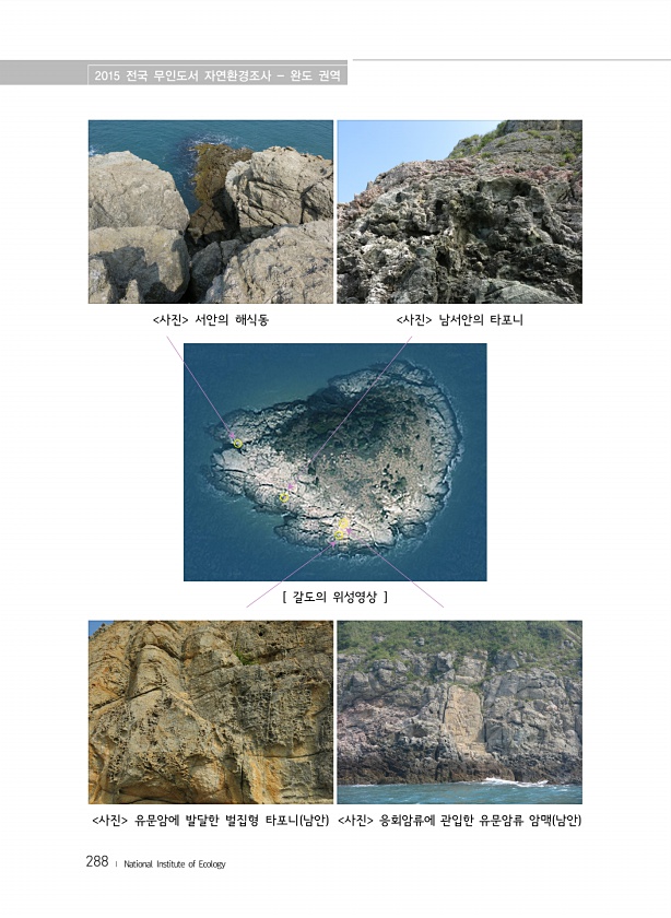 2015 전국 무인도서 자연환경조사 완도 권역 288 ? National Institute of Ecology [ 갈도의 위성영상 ] 사진 서안의 해식동 사진 남서안의 타포니 사진 유문암에 발달한 벌집형 타포니 남안 사진 응회암류에 관입한 유문암류 암맥 남안