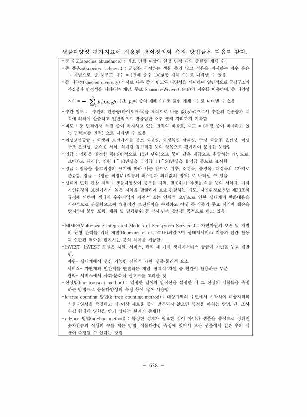 628 ?종 수도 species abundance 최소 면적 이상의 일정 면적 내의 종류별 개체 수 ?종 풍부도 species richness 군집을 구성하는 생물 종의 많고 적음을 지시하는 지수 혹은 그 개념으로, 종 풍부도 지수 = 전체 종수-1 /ln 총 개체 수 로 나타낼 수 있음 ?종 다양성 species diversity 서로 다른 종의 빈도와 다양성을 의미하며 일반적으로 군집구조의 복잡성과 안정성을 나타내는 개념. 주로 Shannon-Weaver 1949 의 지수를 이용하며, 종 다양성 지수 = ∑ S i= 1 p ilog 2p i 단, ??=i 종의 개체 수/ 총 출현 개체 수 로 나타낼 수 있음 ?수간 밀도 수간의 건중량 바이오매스 을 재적으로 나눈 값 g/㎤ 으로서 수간의 건중량과 재 적에...
