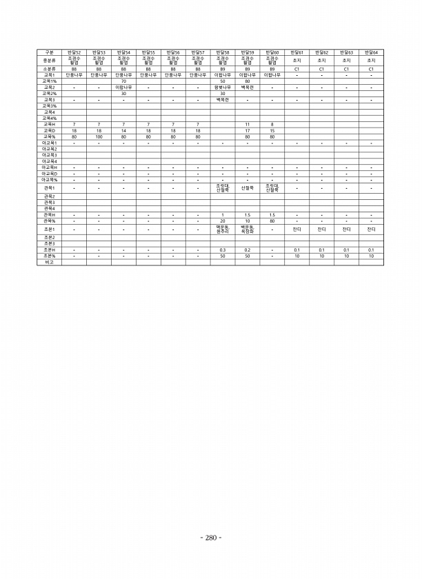 구분 반달52 반달53 반달54 반달55 반달56 반달57 반달58 반달59 반달60 반달61 반달62 반달63 반달64 중분류 조경수 활엽 조경수 활엽 조경수 활엽 조경수 활엽 조경수 활엽 조경수 활엽 조경수 활엽 조경수 활엽 조경수 활엽 초지 초지 초지 초지 소분류 B8 B8 B8 B8 B8 B8 B9 B9 B9 C1 C1 C1 C1 교목1 단풍나무 단풍나무 단풍나무 단풍나무 단풍나무 단풍나무 이팝나무 이팝나무 이팝나무 교목1% 70 50 80 교목2 이팝나무 왕벚나무 백목련 교목2% 30 30 교목3 백목련 교목3% 교목4 교목4% 교목H 7 7 7 7 7 7 11 8 교목D 18 18 14 18 18 18 17 15 교목% 80 100 80 80 80 80 80 80 아교목1 아교목2 아교목3 아교목...
