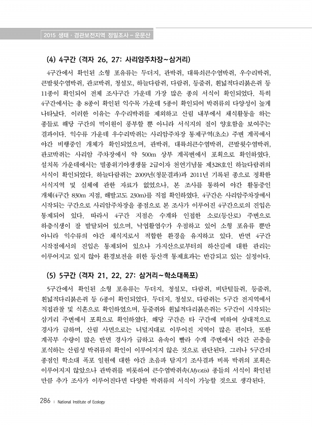2015 생태·경관보전지역 정밀조사 운문산 286 ? National Institute of Ecology 4 4구간 격자 26, 27사리암주차장∼삼거리 4구간에서 확인된 소형 포유류는 두더지, 관박쥐, 대륙쇠큰수염박쥐, 우수리박쥐, 큰발윗수염박쥐, 관코박쥐, 청설모, 하늘다람쥐, 다람쥐, 등줄쥐, 흰넓적다리붉은쥐 등 11종이 확인되어 전체 조사구간 가운데 가장 많은 종의 서식이 확인되었다. 특히 4구간에서는 총 8종이 확인된 익수목 가운데 5종이 확인되어 박쥐류의 다양성이 높게 나타났다. 이러한 이유는 우수리박쥐를 제외하고 산림 내부에서 채식활동을 하는 종들로 해당 구간의 먹이원이 풍부할 뿐 아니라 서식지의 질이 양호함을 보여주는 결과이다. 익수류 가운데 우수리박쥐는 사리암주차장 통제구역 초소 주변 계곡에...