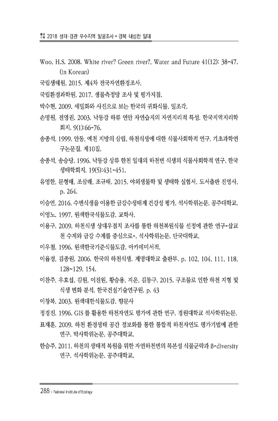 2018 생태·경관 우수지역 발굴조사 경북 내성천 일대 288 ? National Institute of Ecology Woo, H.S. 2008. White river? Green river?, Water and Future 41 12 38-47. in Korean 국립생태원. 2015. 제4차 전국자연환경조사. 국립환경과학원. 2017. 생물측정망 조사 및 평가지침. 박수현. 2009. 세밀화와 사진으로 보는 한국의 귀화식물. 일조각. 손명원, 전영권. 2003. 낙동강 하류 연안 자연습지의 자연지리적 특성. 한국지역지리학 회지. 9 1 66-76. 송종석. 1999. 안동, 예천 지방의 삼림, 하천식생에 대한 식물사회학적 연구. 기초과학연 구논문집. 제10집. 송종석, 송승당. 1996. 낙동강 상류 ...
