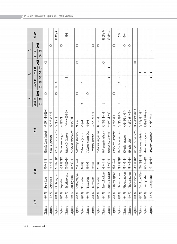2016 백두대간보호지역 생태계 조사 밀재묘적재 286Ⅰwww.nie.re.kr 목명 과명 종명 A B C 희양산 비고* 2008 조령산 주흘산 2008 투구봉 2008 S1 S2 S3 S4 S5 S6 S7 S8 S9 Diptera 파리목 Syrphidae 꽃등에과 Metasyrphus Scaeva komabensis 육점박이꽃등에 ◎ ◎ Diptera 파리목 Syrphidae 꽃등에과 Scaeva pyrastri 닻무늬꽃등에 ◎ Diptera 파리목 Stratiomyidae 동애등에과 Ptecticus tenebrifer 동애등에 ◎ 3 3 환경정화 Diptera 파리목 Sepsidae 꼭지파리과 Sepsis monostigma 꼭지파리 ◎ Diptera 파리목 Stratiomyidae 동애등에과 Herm...