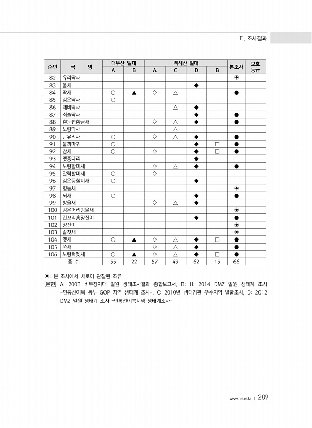 Ⅱ. 조사결과 www.nie.re.kr ? 289 순번 국 명 대우산 일대 백석산 일대 본조사 보호 A B A C D B 등급 82 유리딱새 ? 83 울새 ◆ 84 딱새 ○ ▲ ? △ ● 85 검은딱새 ○ 86 제비딱새 △ ◆ 87 쇠솔딱새 ◆ ● 88 흰눈썹황금새 ? △ ◆ ● 89 노랑딱새 △ 90 큰유리새 ○ ? △ ◆ ● 91 물까마귀 ○ ◆ □ ● 92 참새 ○ ? ◆ □ ● 93 멧종다리 ◆ 94 노랑할미새 ? △ ◆ ● 95 알락할미새 ○ ? 96 검은등할미새 ○ ◆ 97 힝둥새 ? 98 되새 ○ ◆ ● 99 방울새 ? △ ◆ 100 검은머리방울새 ? 101 긴꼬리홍양진이 ◆ ● 102 양진이 ? 103 솔잣새 ? 104 멧새 ○ ▲ ? △ ◆ □ ● 105 쑥새 ? △ ◆ ● 106 노랑턱멧새...