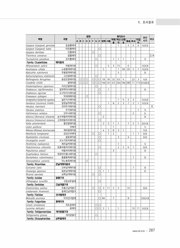 Ⅱ. 조사결과 www.nie.re.kr ? 287 학명 국명 문헌 현지조사 조사 A B C D E F G H 빙애 사동 덕현 시기 비고 골 덕산 리 산명 호 동송 토교 이길 리 Gargara Gargara genistae 동굴뿔매미 1 2 6 6 1d,2d,3d Gargara Gargara katoi 띠띤뿔매미 ○ Gargara donitzae 민뿔매미 ○ Tricentrus coreanus 참뿔매미 ○ 고,국 Tsunozemia paradoxa 모지뿔매미 ○ 1 1 1 1 1d Family Cicadellidae 매미충과 Athysanopsis salicis 버들매미충 ○ 5 3 15 6 1d,2d,3d Austroasca vittata 노랑줄애매미충 5 1 58 20 5 7 1d,2d,3d Balclut...
