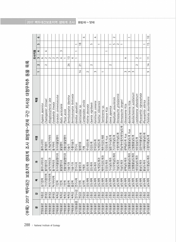 288 문 강 목 과 국명 학명 조사지점 1 2 3 4 5 6 편형동물문 와충강 삼기장목 플라나리아과 플라나리아 Dugesia japonica 6 환형동물문 환대강 가시지렁이목 물지렁이과 물지렁이 Chaetogaster limnaei 2 2 4 환형동물문 환대강 부리거머리목 넙적거머리과 조개넙적거머리 Alboglossiphonia lata 2 환형동물문 환대강 턱거머리목 돌거머리과 돌거머리 Erpobdella lineata 2 연체동물문 복족강 기안목 또아리물달팽이과 또아리물달팽이 Gyraulus convexiusculus 3 연체동물문 복족강 기안목 물달팽이과 물달팽이 Radix auricularia 4 3 연체동물문 복족강 기안목 왼돌이물달팽이과 왼돌이물달팽이 Physa acuta 1 연체동물문 복족강 ...