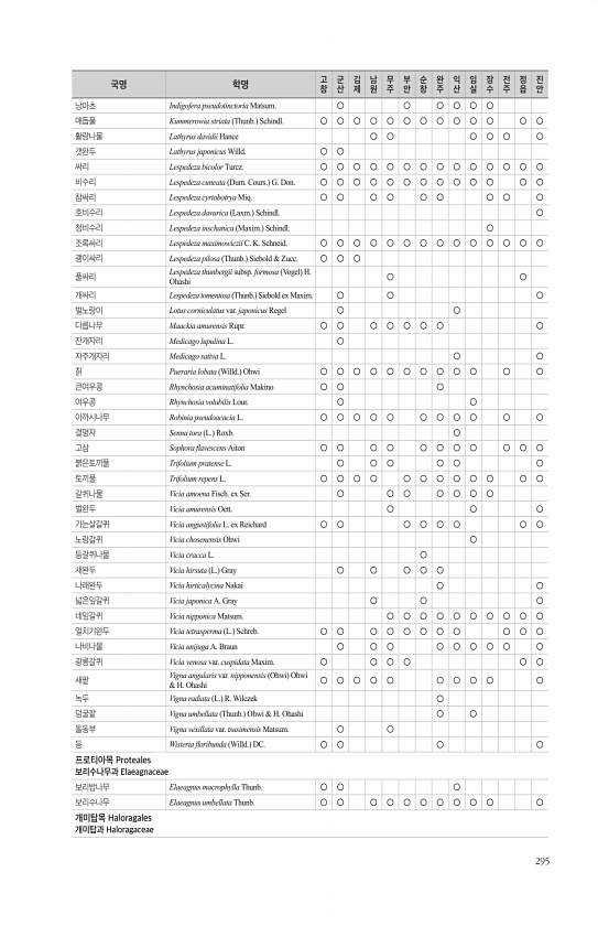 295 낭아초 Indigofera pseudotinctoria Matsum. ○ ○ ○ ○ ○ ○ 매듭풀 Kummerowia striata Thunb. Schindl. ○ ○ ○ ○ ○ ○ ○ ○ ○ ○ ○ ○ ○ 활량나물 Lathyrus davidii Hance ○ ○ ○ ○ ○ ○ 갯완두 Lathyrus japonicus Willd. ○ ○ 싸리 Lespedeza bicolor Turcz. ○ ○ ○ ○ ○ ○ ○ ○ ○ ○ ○ ○ ○ ○ 비수리 Lespedeza cuneata Dum. Cours. G. Don. ○ ○ ○ ○ ○ ○ ○ ○ ○ ○ ○ ○ ○ 참싸리 Lespedeza cyrtobotrya Miq. ○ ○ ○ ○ ○ ○ ○ ○ ○ 호비수리 Lespedeza davurica Laxm. Sch...