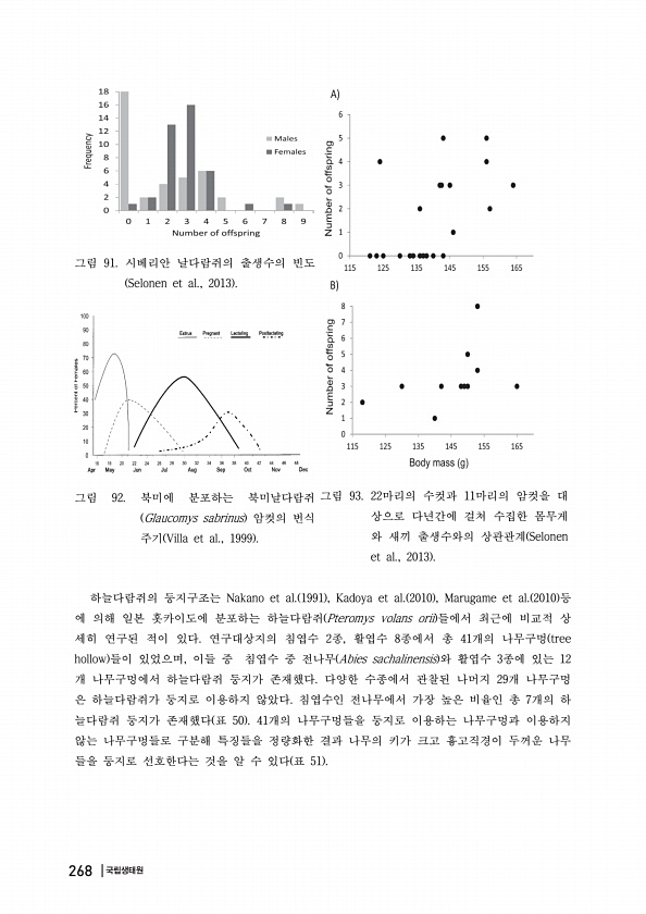 그림 93. 22마리의 수컷과 11마리의 암컷을 대 상으로 다년간에 걸쳐 수집한 몸무게 와 새끼 출생수와의 상관관계 Selonen et al., 2013 그림 91. 시베리안 날다람쥐의 출생수의 빈도 Selonen et al., 2013 그림 92. 북미에 분포하는 북미날다람쥐 Glaucomys sabrinus 암컷의 번식 주기 Villa et al., 1999 하늘다람쥐의 둥지구조는 Nakano et al. 1991 , Kadoya et al. 2010 , Marugame et al. 2010 등 에 의해 일본 홋카이도에 분포하는 하늘다람쥐 Pteromys volans orii 들에서 최근에 비교적 상 세히 연구된 적이 있다. 연구대상지의 침엽수 2종, 활엽수 8종에서 총 41개의 나무구멍 tree hol...