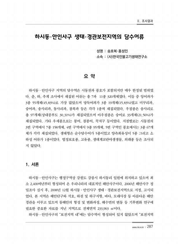 Ⅱ. 조사결과 www.nie.re.kr ? 287 하시동·안인사구 생태·경관보전지역의 담수어류 성명 송호복·홍성민 소속 사 한국민물고기생태연구소 요 약 하시동·안인사구 지역의 담수역은 시동천과 풍호가 포함되지만 매우 한정된 범위였 다. 춘, 하, 추계 조사에서 채집된 어류는 총 7과 11종 320개체였다. 이들 중 잉어과가 3종 55개체 45.83% 로 가장 많았으며 망둑어과가 3종 19개체 15.83% 였고 미꾸리과, 숭어과, 송사리과, 동사리과, 참복과 등은 각각 1종씩 채집되었다. 우점종은 송사리로 총 97개체 상대풍부도 30.31% 가 채집되었으며 아우점종은 숭어로 33개체 21.56% 가 채집되었다. 기타 우세종으로는 붕어, 참붕어, 꾹저구 등이었다. 지점별로는 시동천의 3번 구역에서 7종 158개...