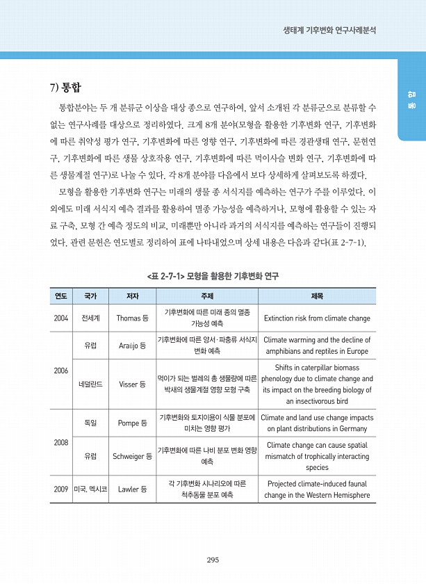 295 생태계 기후변화 연구사례분석 통 합 7 통합 통합분야는 두 개 분류군 이상을 대상 종으로 연구하여, 앞서 소개된 각 분류군으로 분류할 수 없는 연구사례를 대상으로 정리하였다. 크게 8개 분야 모형을 활용한 기후변화 연구, 기후변화 에 따른 취약성 평가 연구, 기후변화에 따른 영향 연구, 기후변화에 따른 경관생태 연구, 문헌연 구, 기후변화에 따른 생물 상호작용 연구, 기후변화에 따른 먹이사슬 변화 연구, 기후변화에 따 른 생물계절 연구 로 나눌 수 있다. 각 8개 분야를 다음에서 보다 상세하게 살펴보도록 하겠다. 모형을 활용한 기후변화 연구는 미래의 생물 종 서식지를 예측하는 연구가 주를 이루었다. 이 외에도 미래 서식지 예측 결과를 활용하여 멸종 가능성을 예측하거나, 모형에 활용할 수 있는 자 료 ...