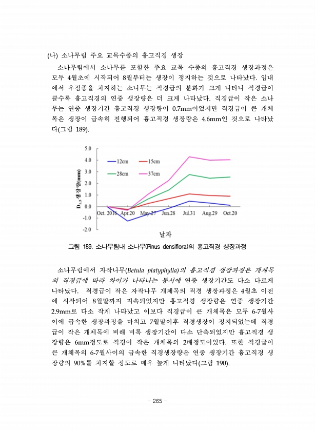나 소나무림 주요 교목수종의 흉고직경 생장 소나무림에서 소나무를 포함한 주요 교목 수종의 흉고직경 생장과정은 모두 4월초에 시작되어 8월부터는 생장이 정지하는 것으로 나타났다. 임내 에서 우점종을 차지하는 소나무는 직경급의 분화가 크게 나타나 직경급이 클수록 흉고직경의 연중 생장량은 더 크게 나타났다. 직경급이 작은 소나 무는 연중 생장기간 흉고직경 생장량이 0.7mm이었지만 직경급이 큰 개체 목은 생장이 급속히 진행되어 흉고직경 생장량은 4.6mm인 것으로 나타났 다 그림 189 그림 189. 소나무림내 소나무 Pinus densiflora 의 흉고직경 생장과정 소나무림에서 자작나무 Betula platyphylla 의 흉고직경 생장과정은 개체목 의 직경급에 따라 차이가 나타나는 동시에 연중 생장기간도 다...