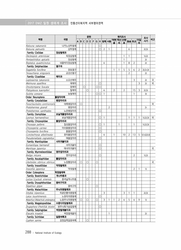 2017 DMZ 일원 생태계 조사 민통선이북지역 서부평야권역 288 ? National Institute of Ecology 학명 국명 문헌 현지조사 조사 A B C D E F G H 빙애 사동 덕현 시기 비고 골 덕산 리 산명 호 동송 토교 이길 리 Raivuna nakanonis 나카노상투벌레 ○ Raivuna patruelis 상투벌레 ○ 2 1 6 2d,3d Family Cixiidae 장삼벌레과 Oecleopsis artemisiae 쑥장삼벌레 1 1 1d,2d Pentastiridius apicalis 장삼벌레 1 2d Reptalus quadricinctus 네줄박이장삼벌레 4 1 8 2 2d Family Delphacidae 멸구과 Sogatella furcifera 흰등멸구 1 1 5 5 6...