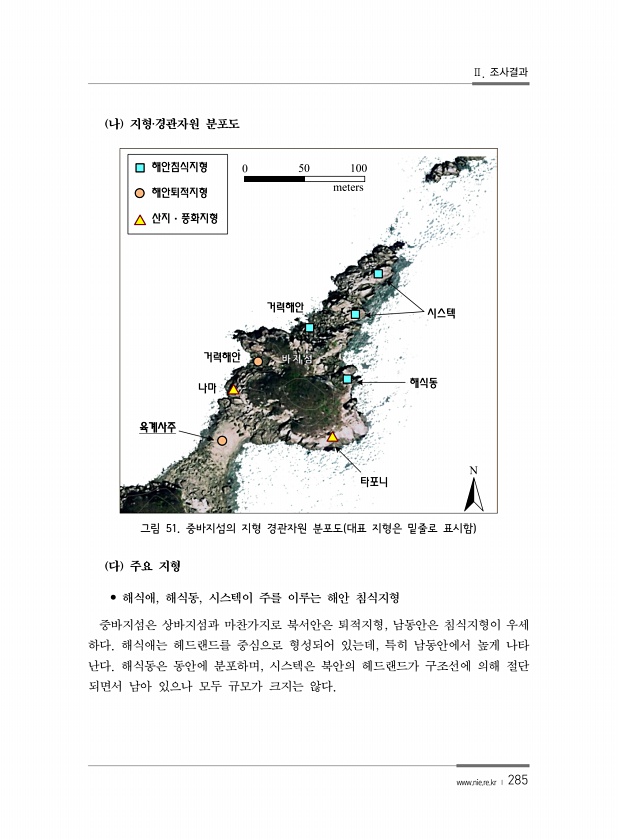 Ⅱ. 조사결과 www.nie.re.kr ? 285 나 지형?경관자원 분포도 그림 51. 중바지섬의 지형 경관자원 분포도 대표 지형은 밑줄로 표시함 다 주요 지형 ? 해식애, 해식동, 시스텍이 주를 이루는 해안 침식지형 중바지섬은 상바지섬과 마찬가지로 북서안은 퇴적지형, 남동안은 침식지형이 우세 하다. 해식애는 헤드랜드를 중심으로 형성되어 있는데, 특히 남동안에서 높게 나타 난다. 해식동은 동안에 분포하며, 시스텍은 북안의 헤드랜드가 구조선에 의해 절단 되면서 남아 있으나 모두 규모가 크지는않다.