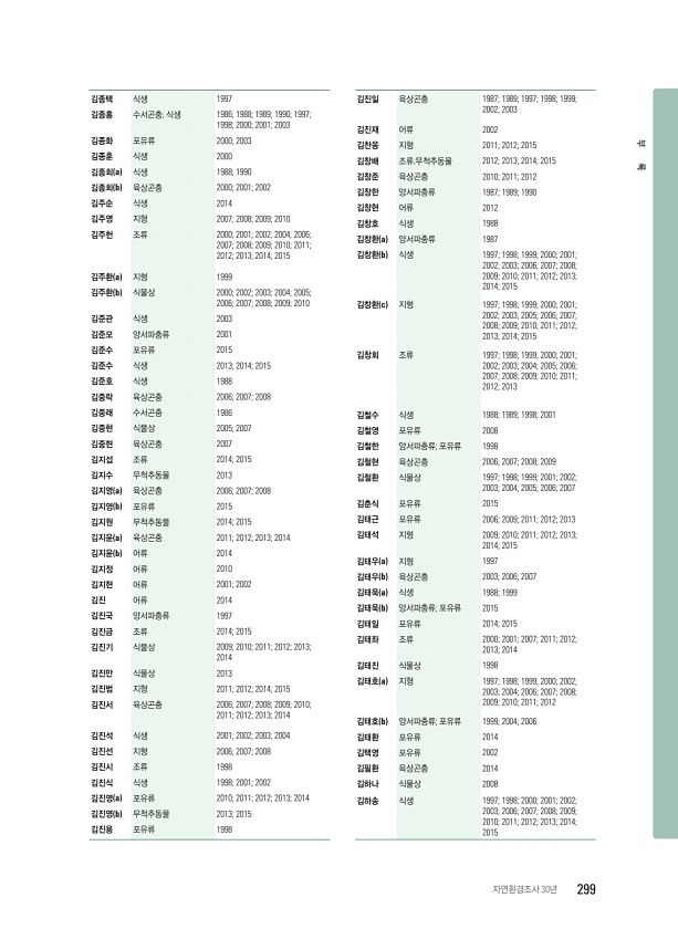 김종택 식생 1997 김종홍 수서곤충; 식생 1986; 1988; 1989; 1990; 1997; 1998; 2000; 2001; 2003 김종화 포유류 2000; 2003 김종훈 식생 2000 김종희 a 식생 1988; 1990 김종희 b 육상곤충 2000; 2001; 2002 김주순 식생 2014 김주영 지형 2007; 2008; 2009; 2010 김주헌 조류 2000; 2001; 2002; 2004; 2006; 2007; 2008; 2009; 2010; 2011; 2012; 2013; 2014; 2015 김주환 a 지형 1999 김주환 b 식물상 2000; 2002; 2003; 2004; 2005; 2006; 2007; 2008; 2009; 2010 김준관 식생 2003 김준모 양서파충류 2001 김...