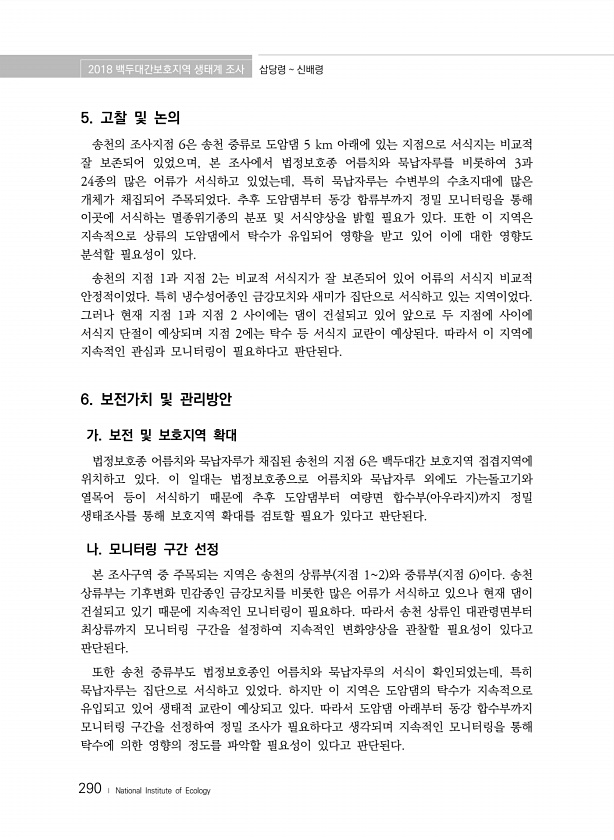 2018 백두대간보호지역 생태계 조사 삽당령 신배령 290 ? National Institute of Ecology 5. 고찰 및 논의 송천의 조사지점 6은 송천 중류로 도암댐 5 km 아래에 있는 지점으로 서식지는 비교적 잘 보존되어 있었으며, 본 조사에서 법정보호종 어름치와 묵납자루를 비롯하여 3과 24종의 많은 어류가 서식하고 있었는데, 특히 묵납자루는 수변부의 수초지대에 많은 개체가 채집되어 주목되었다. 추후 도암댐부터 동강 합류부까지 정밀 모니터링을 통해 이곳에 서식하는 멸종위기종의 분포 및 서식양상을 밝힐 필요가 있다. 또한 이 지역은 지속적으로 상류의 도암댐에서 탁수가 유입되어 영향을 받고 있어 이에 대한 영향도 분석할 필요성이 있다. 송천의 지점 1과 지점 2는 비교적 서식지가 잘 보존되어 있...