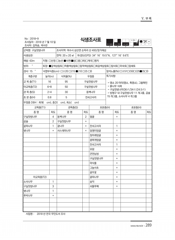 V. 부 록 www.nie.re.kr ?289 No 2018-9 조사일자 2018 년 7 월 10 일 조사자김하송, 곽수란 식생조사표 군락명구실잣밤나무 조사지역여수시 삼산면 손죽리 산 493/장거래섬 식생상관면적20 x 20 ㎡ 위?경도 GPS 34° 16′ 19.5″N, 127° 16′ 9.6E 해발63m 지형□산정 □능선 ■사면 ■상□중□하 □계곡□평지 방위° 토양■갈색삼림토□적황색삼림토□암적색삼림토□회갈색삼림토□침식토□미숙토□암쇄토 경사15 ° 낙엽부식층 cm □≥20 □ 15 ■ 10 □ 5 □0 암석노출 % □≥51□ 50□ 25■ 5□0 계층구분 높이 m 식피율 % 우점종 특기사항염소 20 마리 염소, 흑염소 , 그물확인 붉나무 식재 구실잣밤나무 36?/34?/24.5? 방형구 내 구실잣밤나무 1...