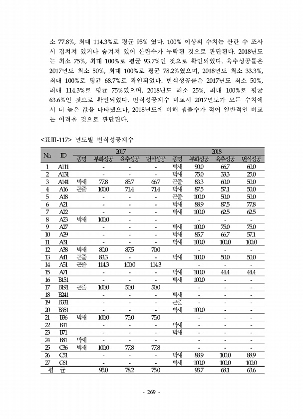 269 소 77.8%, 최대 114.3%로 평균 95% 였다. 100% 이상의 수치는 산란 수 조사 시 겹쳐져 있거나 숨겨져 있어 산란수가 누락된 것으로 판단된다. 2018년도 는 최소 75%, 최대 100%로 평균 93.7%인 것으로 확인되었다. 육추성공률은 2017년도 최소 50%, 최대 100%로 평균 78.2%였으며, 2018년도 최소 33.3%, 최대 100%로 평균 68.7%로 확인되었다. 번식성공률은 2017년도 최소 50%, 최대 114.3%로 평균 75%였으며, 2018년도 최소 25%, 최대 100%로 평균 63.6%인 것으로 확인되었다. 번식성공계수 비교시 2017년도가 모든 수치에 서 더 높은 값을 나타냈으나, 2018년도에 비해 샘플수가 적어 일반적인 비교 는 어려울 것으로 판단된다....