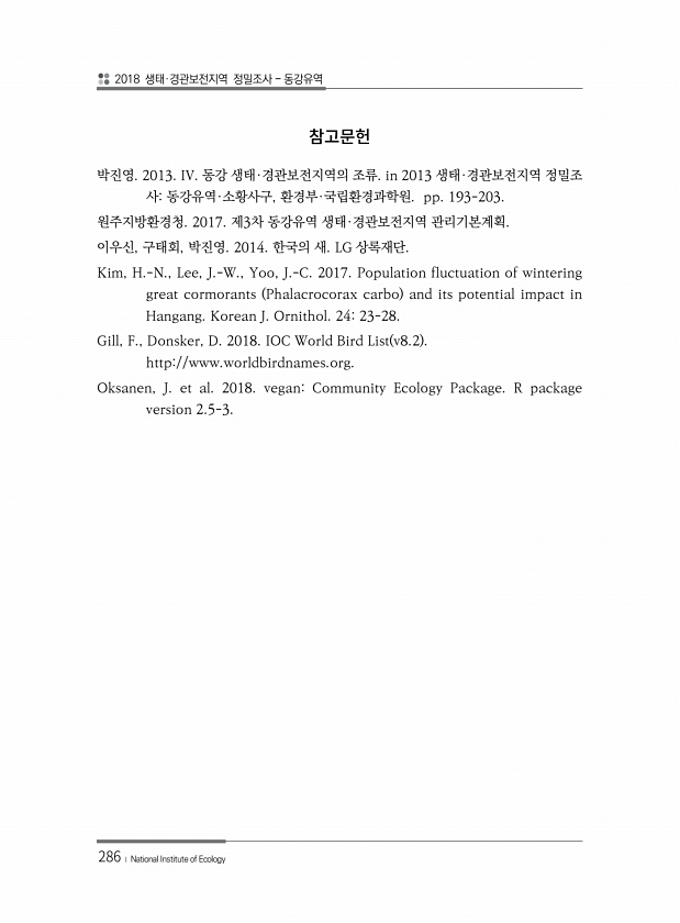 2018 생태·경관보전지역 정밀조사 동강유역 286 ? National Institute of Ecology 박진영. 2013. IV. 동강 생태·경관보전지역의 조류. in 2013 생태·경관보전지역 정밀조 사동강유역·소황사구, 환경부·국립환경과학원. pp. 193-203. 원주지방환경청. 2017. 제3차 동강유역 생태·경관보전지역 관리기본계획. 이우신, 구태회, 박진영. 2014. 한국의 새. LG 상록재단. Kim, H.-N., Lee, J.-W., Yoo, J.-C. 2017. Population fluctuation of wintering great cormorants Phalacrocorax carbo and its potential impact in Hangang. Korean J. Ornith...