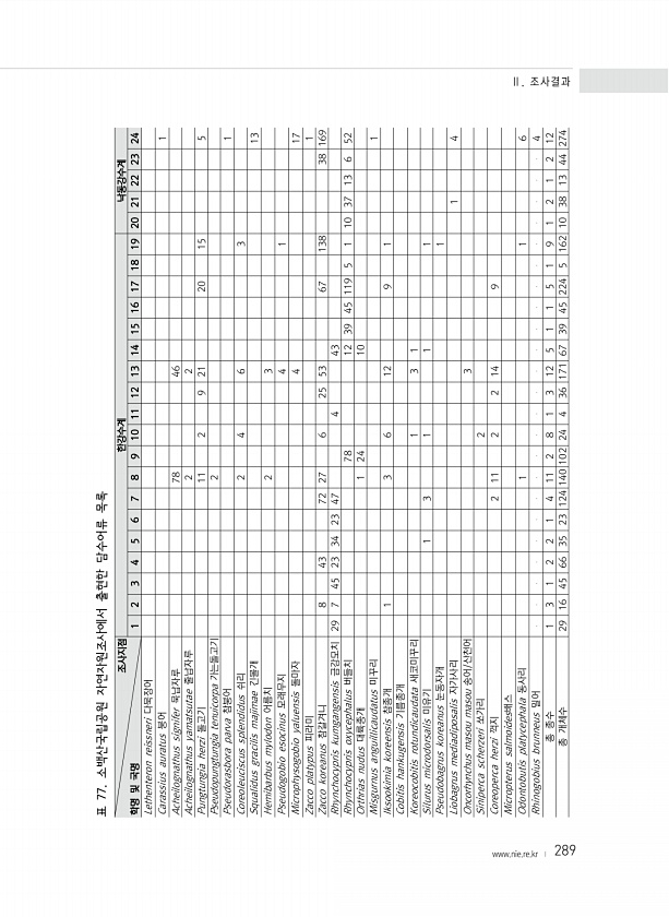 289 표 77. 소백산국립공원 자연자원조사에서 출현한 담수어류 목록 조사지점 학명 및 국명 한강수계 낙동강수계 1 2 3 4 5 6 7 8 9 10 11 12 13 14 15 16 17 18 19 20 21 22 23 24 Lethenteron reissneri 다묵장어 Carassius auratus 붕어 1 Acheilognathus signifer 묵납자루 78 46 Acheilognathus yamatsutae 줄납자루 2 2 Pungtungia herzi 돌고기 11 2 9 21 20 15 5 Pseudopungtungia tenuicorpa 가는돌고기 2 Pseudorasbora parva 참붕어 1 Coreoleuciscus splendidus 쉬리 2 4 6 3 Squalidus gracil...