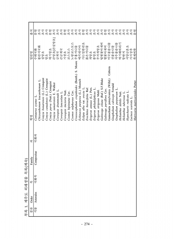 분류 Order 목 Family 과 학명 일반명 출처 식물 Asterales 국화목 Compositae 국화과 Centaurea cyanus L. 수레국화 문헌 Chrysanthemum leucanthemum L. 불란서국화 조사 Conyza bonariensis L. Cronquist 실망초 조사 Conyza canadensis L. Cronquist 망초 조사 Conyza parva Nutt. Cronquist 애기망초 문헌 Conyza sumatrensis E. Walker 큰망초[큰실망초] 조사 Coreopsis drummondii L. 금계국 조사 Coreopsis lanceolata L. 큰금계국 조사 Coreopsis tinctoria Nutt. 기생초 문헌 Cosmos bipinnatus Ca...
