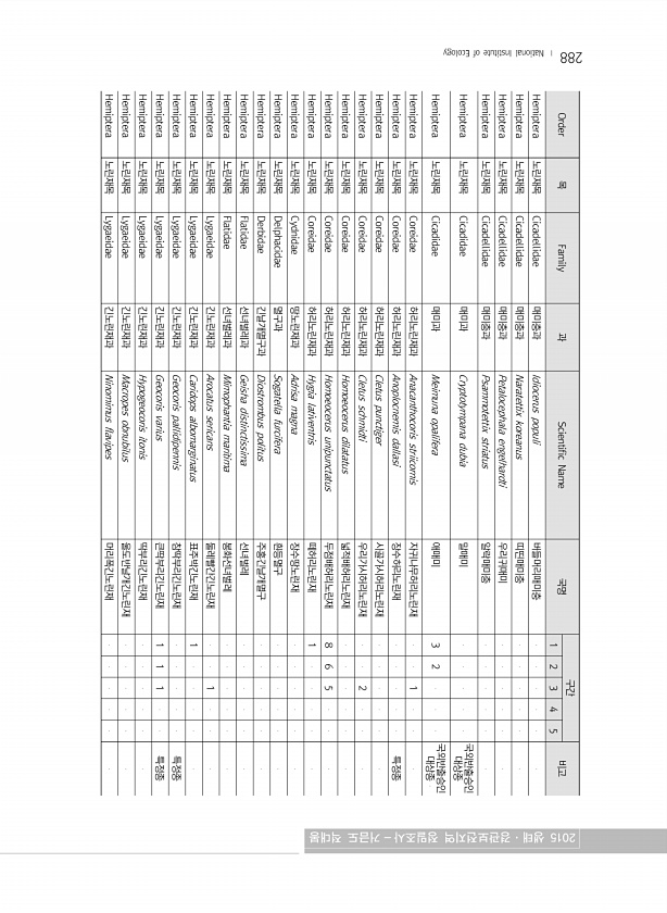 288 Order 목 Family 과 Scientific Name 국명 구간 비고 1 2 3 4 5 Hemiptera 노린재목 Cicadellidae 매미충과 Idiocerus populi 버들머리매미충 Hemiptera 노린재목 Cicadellidae 매미충과 Naratettix koreanus 띠띤매미충 Hemiptera 노린재목 Cicadellidae 매미충과 Petalocephala engelhardti 우리귀매미 Hemiptera 노린재목 Cicadellidae 매미충과 Psammotettix striatus 알락매미충 Hemiptera 노린재목 Cicadidae 매미과 Cryptotympana dubia 말매미 ...