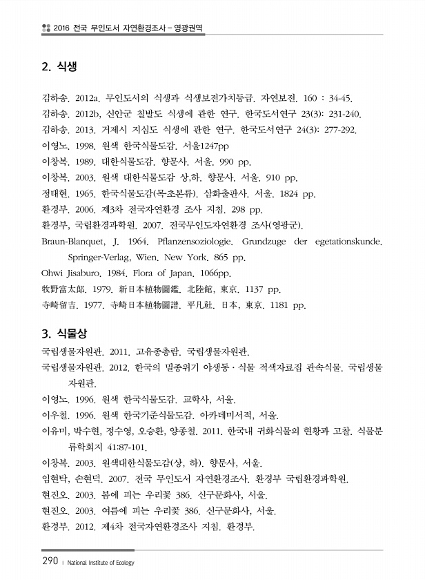 2016 전국 무인도서 자연환경조사 영광권역 290 ? National Institute of Ecology 2. 식생 김하송. 2012a. 무인도서의 식생과 식생보전가치등급. 자연보전. 160 34-45. 김하송. 2012b, 신안군 칠발도 식생에 관한 연구. 한국도서연구 23 3 231-240. 김하송. 2013. 거제시 지심도 식생에 관한 연구. 한국도서연구 24 3 277-292. 이영노. 1998. 원색 한국식물도감. 서울1247pp 이창복. 1989. 대한식물도감. 향문사. 서울. 990 pp. 이창복. 2003. 원색 대한식물도감 상,하. 향문사. 서울. 910 pp. 정태현. 1965. 한국식물도감 목?초본류 삼화출판사. 서울. 1824 pp. 환경부. 2006. 제3차 전국자연환경 조사 지침...