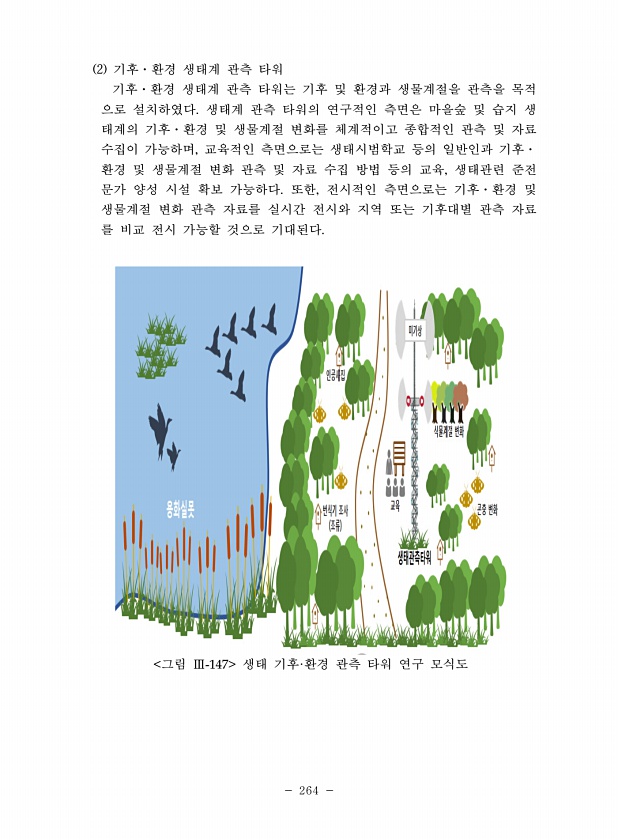264 2 기후·환경 생태계 관측 타워 기후·환경 생태계 관측 타워는 기후 및 환경과 생물계절을 관측을 목적 으로 설치하였다. 생태계 관측 타워의 연구적인 측면은 마을숲 및 습지 생 태계의 기후·환경 및 생물계절 변화를 체계적이고 종합적인 관측 및 자료 수집이 가능하며, 교육적인 측면으로는 생태시범학교 등의 일반인과 기후· 환경 및 생물계절 변화 관측 및 자료 수집 방법 등의 교육, 생태관련 준전 문가 양성 시설 확보 가능하다. 또한, 전시적인 측면으로는 기후·환경 및 생물계절 변화 관측 자료를 실시간 전시와 지역 또는 기후대별 관측 자료 를 비교 전시 가능할 것으로 기대된다. 그림 Ⅲ-147 생태 기후·환경 관측 타워 연구모식도