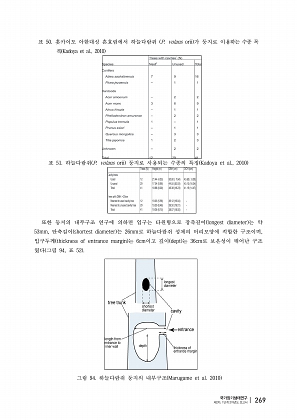 표 50. 홋카이도 아한대성 혼효림에서 하늘다람쥐 P. volans orii 가 둥지로 이용하는 수종 목 록 Kadoya et al., 2010 표 51. 하늘다람쥐 P. volans orii 둥지로 사용되는 수종의 특징 Kadoya et al., 2010 또한 둥지의 내부구조 연구에 의하면 입구는 타원형으로 장축길이 longest diameter 는 약 53mm, 단축길이 shortest diameter 는 26mm로 하늘다람쥐 성체의 머리모양에 적합한 구조이며, 입구두께 thickness of entrance margin 는 6cm이고 깊이 dept 는 36cm로 보온성이 뛰어난 구조 였다 그림 94, 표 52 그림 94. 하늘다람쥐 둥지의 내부구조 Marugame et al. 2010 국가장기생태연구 ...