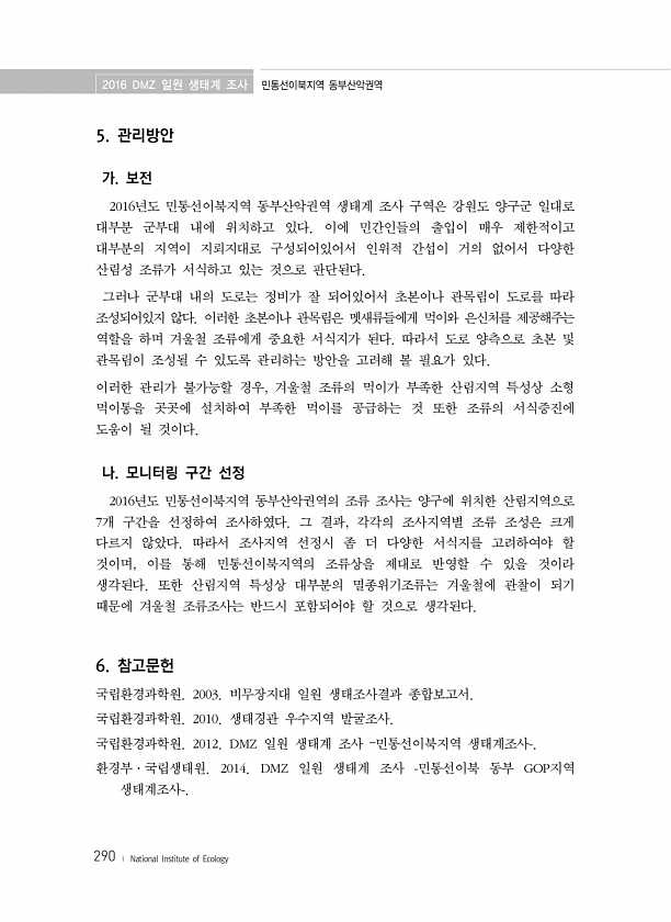 2016 DMZ 일원 생태계 조사 민통선이북지역 동부산악권역 290 ? National Institute of Ecology 5. 관리방안 가. 보전 2016년도 민통선이북지역 동부산악권역 생태계 조사 구역은 강원도 양구군 일대로 대부분 군부대 내에 위치하고 있다. 이에 민간인들의 출입이 매우 제한적이고 대부분의 지역이 지뢰지대로 구성되어있어서 인위적 간섭이 거의 없어서 다양한 산림성 조류가 서식하고 있는 것으로 판단된다. 그러나 군부대 내의 도로는 정비가 잘 되어있어서 초본이나 관목림이 도로를 따라 조성되어있지 않다. 이러한 초본이나 관목림은 멧새류들에게 먹이와 은신처를 제공해주는 역할을 하며 겨울철 조류에게 중요한 서식지가 된다. 따라서 도로 양측으로 초본 및 관목림이 조성될 수 있도록 관리하는 방안을 ...
