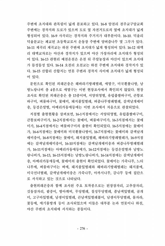 주변에 초지대와 관목림이 넓게 분포하고 있다. 16-8 암천리 천주교구담교회 주변에는 경작지와 도로가 있으며 도로 옆 자전거도로의 옆에 초지대가 넓게 형성되어 있다. 16-9 사곡리는 경작지와 주거지가 대부분이다. 16-10. 덕율리 덕율분교는 폐교된 초등학교로서 운동장 주변에 양버즘나무 몇 그루가 있다. 16-11 제곡리 제곡교는 하천 주변에 초지대가 넓게 형성되어 있다. 16-12 대맥 리 대맥교차로는 야산과 경작지가 있으며 야산 가장자리에 초지대가 형성되 어 있다. 16-13 관현리 예천온천은 온천 뒤 주말농장과 야산이 있으며 초지대 가 듬성듬성 있다. 16-14 오천리 오천교는 하천 주변에 초지대와 경작지가 있 다. 16-15 산합리 산합지는 연못 주변과 경작지 사이에 초지대가 넓게 형성되 어 있다....
