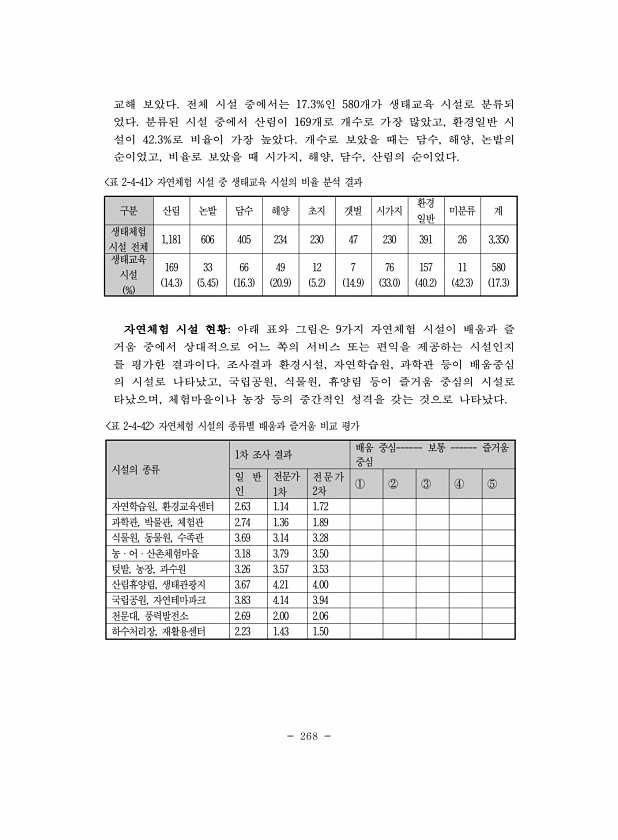 268 교해 보았다. 전체 시설 중에서는 17.3%인 580개가 생태교육 시설로 분류되 었다. 분류된 시설 중에서 산림이 169개로 개수로 가장 많았고, 환경일반 시 설이 42.3%로 비율이 가장 높았다. 개수로 보았을 때는 담수, 해양, 논밭의 순이었고, 비율로 보았을 때 시가지, 해양, 담수, 산림의 순이었다. 구분 산림 논밭 담수 해양 초지 갯벌 시가지 환경 일반 미분류 계 생태체험 시설 전체 1,181 606 405 234 230 47 230 391 26 3,350 생태교육 시설 % 169 14.3 33 5.45 66 16.3 49 20.9 12 5.2 7 14.9 76 33.0 157 40.2 11 42.3 580 17.3 표 2-4-41 자연체험 시설 중 생태교육 시설의 비율 분석 결과 자연체험 ...