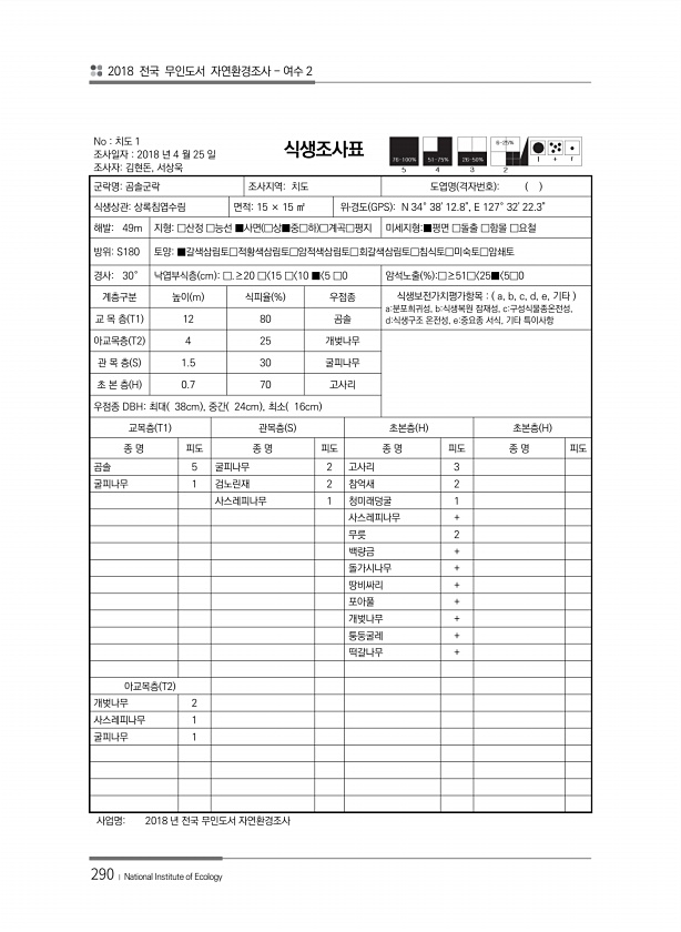 2018 전국 무인도서 자연환경조사 여수 2 290 ? National Institute of Ecology No 치도 1 조사일자 2018 년 4 월 25 일 조사자김현돈, 서상욱 식생조사표 군락명곰솔군락 조사지역치도 도엽명 격자번호 식생상관상록침엽수림 면적15 × 15 ㎡ 위?경도 GPS N 34° 3812.8, E 127° 3222.3해발49m 지형□산정 □능선 ■사면 □상■중□하 □계곡□평지 미세지형■평면 □돌출 □함몰 □요철 방위S180 토양■갈색삼림토□적황색삼림토□암적색삼림토□회갈색삼림토□침식토□미숙토□암쇄토 경사30° 낙엽부식층 cm □.≥20 □ 15 □ 10 ■ 5 □0 암석노출 % □≥51□ 25■ 5□0 계층구분 높이 m 식피율 % 우점종 식생보전가치평가항목 a, b, c, d, e, 기...