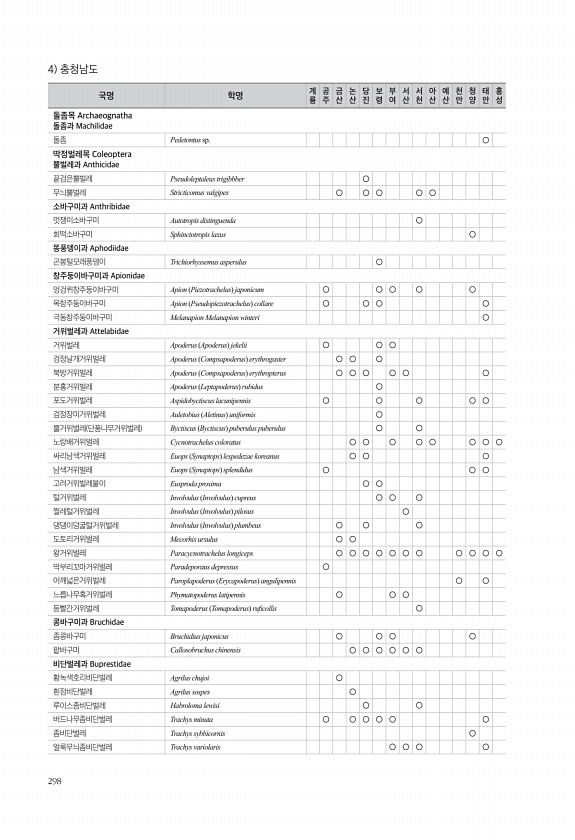 298 4 충청남도 국명 학명 계 룡 공주 금산 논산 당진 보령 부여 서산 서천 아산 예산 천안 청양 태안 홍성 돌좀목 Archaeognatha 돌좀과 Machilidae 돌좀 Pedetontus sp. ○ 딱정벌레목 Coleoptera 뿔벌레과 Anthicidae 끝검은뿔벌레 Pseudoleptaleus trigibbber ○ 무늬뿔벌레 Stricticomus valgipes ○ ○ ○ ○ ○ 소바구미과 Anthribidae 멋쟁이소바구미 Autotropis distinguenda ○ 회떡소바구미 Sphinctotropis laxus ○ 똥풍뎅이과 Aphodiidae 곤봉털모래풍뎅이 Trichiorhyssemus asperulus ○ 창주둥이바구미과 Apionidae 엉겅퀴창주둥이바구미 Apion Piez...