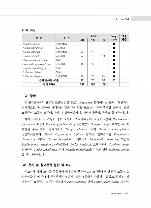 Ⅱ. 조사결과 www.nie.re.kr ? 291 표 94. 계속 학 명 국 명 개체수 Songmeter 멸종 4월 5월 6월 등급 Zoothera aurea 호랑지빠귀 ● Turdus hortulorum 되지빠귀 ● Turdus pallidus 흰배지빠귀 6 5 31 ● Luscinia cyane 쇠유리새 4 10 13 ● Phoenicurus auroreus 딱새 1 3 ● Cyanoptila cyanomelana 큰유리새 10 6 3 ● Fringilla montifringilla 되새 ● Emberiza cioides 멧새 ● Emberiza elegans 노랑턱멧새 16 25 26 ● 전체 종수 총 46종 27 26 20 42 전체 개체수 197 190 159 다. 종합 본 현지조사에서 관찰된 조류...