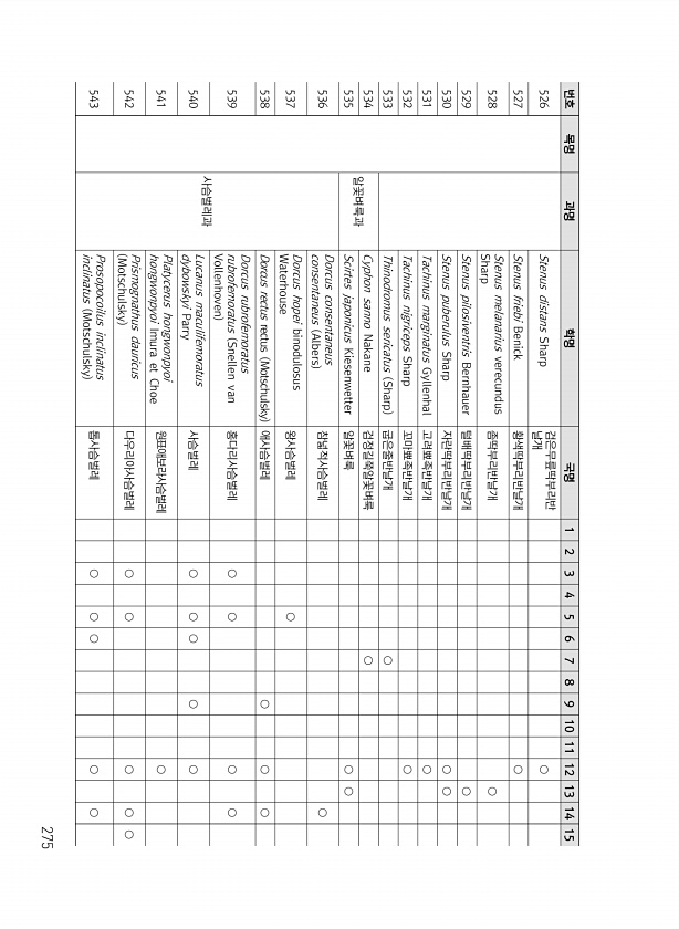 275 번호 목명 과명 학명 국명 1 2 3 4 5 6 7 8 9 10 11 12 13 14 15 526 Stenus distans Sharp 검은무릎딱부리반 날개 ○ 527 Stenus friebi Benick 황색딱부리반날개 ○ 528 Stenus melanarius verecundus Sharp 좀딱부리반날개 ○ 529 Stenus pilosiventris Bernhauer 털배딱부리반날개 ○ 530 Stenus puberulus Sharp 자란딱부리반날개 ○ ○ 531 Tachinus marginatus Gyllenhal 고려뾰족반날개 ○ 532 Tachinus nigriceps Sharp 꼬마뾰족반날개 ○ 533 Thinodromus sericatus Sharp 굽은줄반날개 ○ 534 알꽃벼룩과 C...